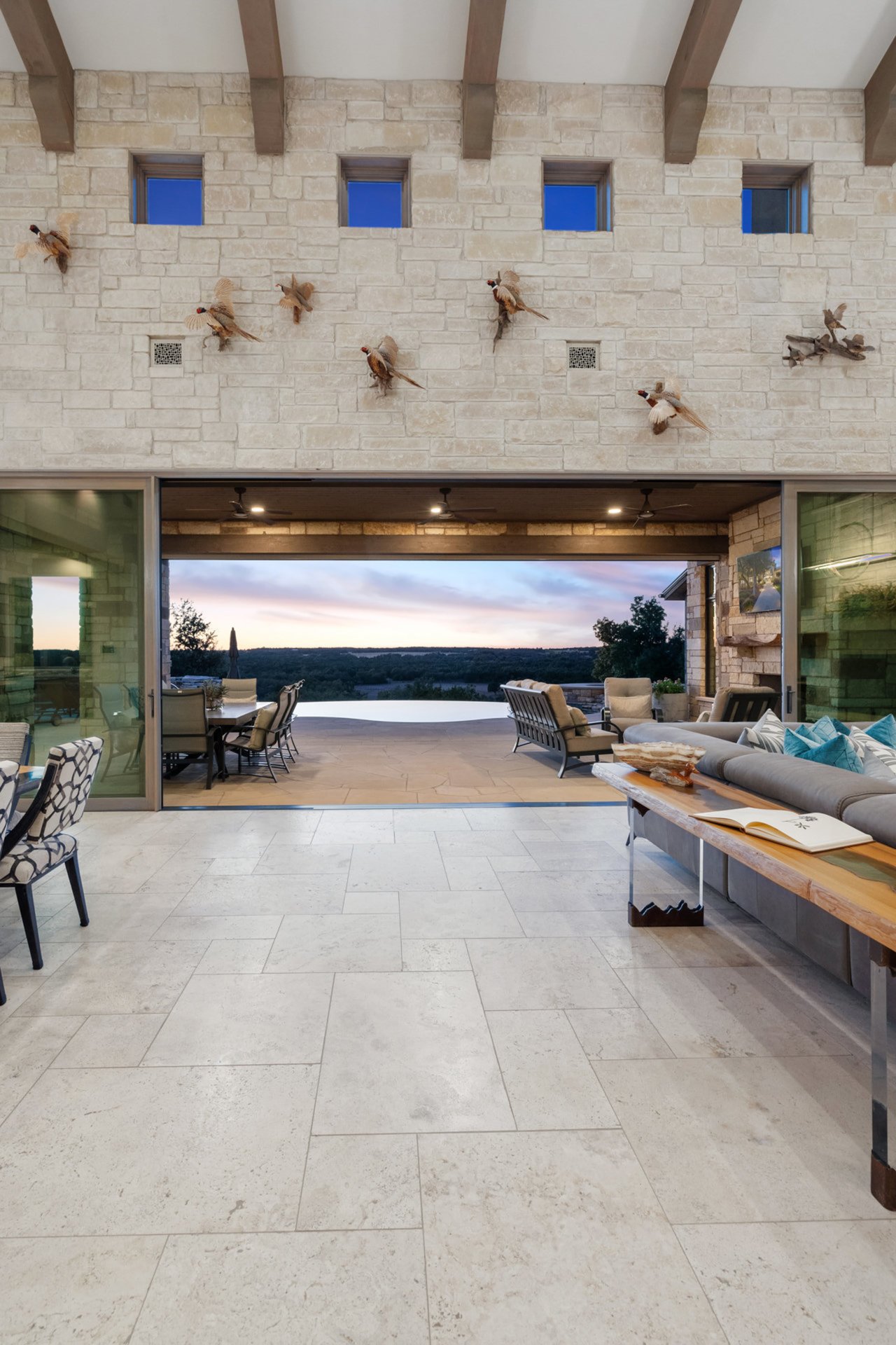 Multiple outdoor entertaining spaces invite you to enjoy the tranquil surroundings. An outdoor kitchen equipped with a sink, gas grill, griddle, kegerator, and refrigerator. Bask in the heated infinity pool with waterfall while enjoying the view of the property meadow and hill country. Soak in a hot tub with waterfall feature near a gas fire pit. There is also a wood burning fire pit perfect for s’mores. The outdoor living area has a cozy gas fireplace, ideal for relaxing evenings under the stars.