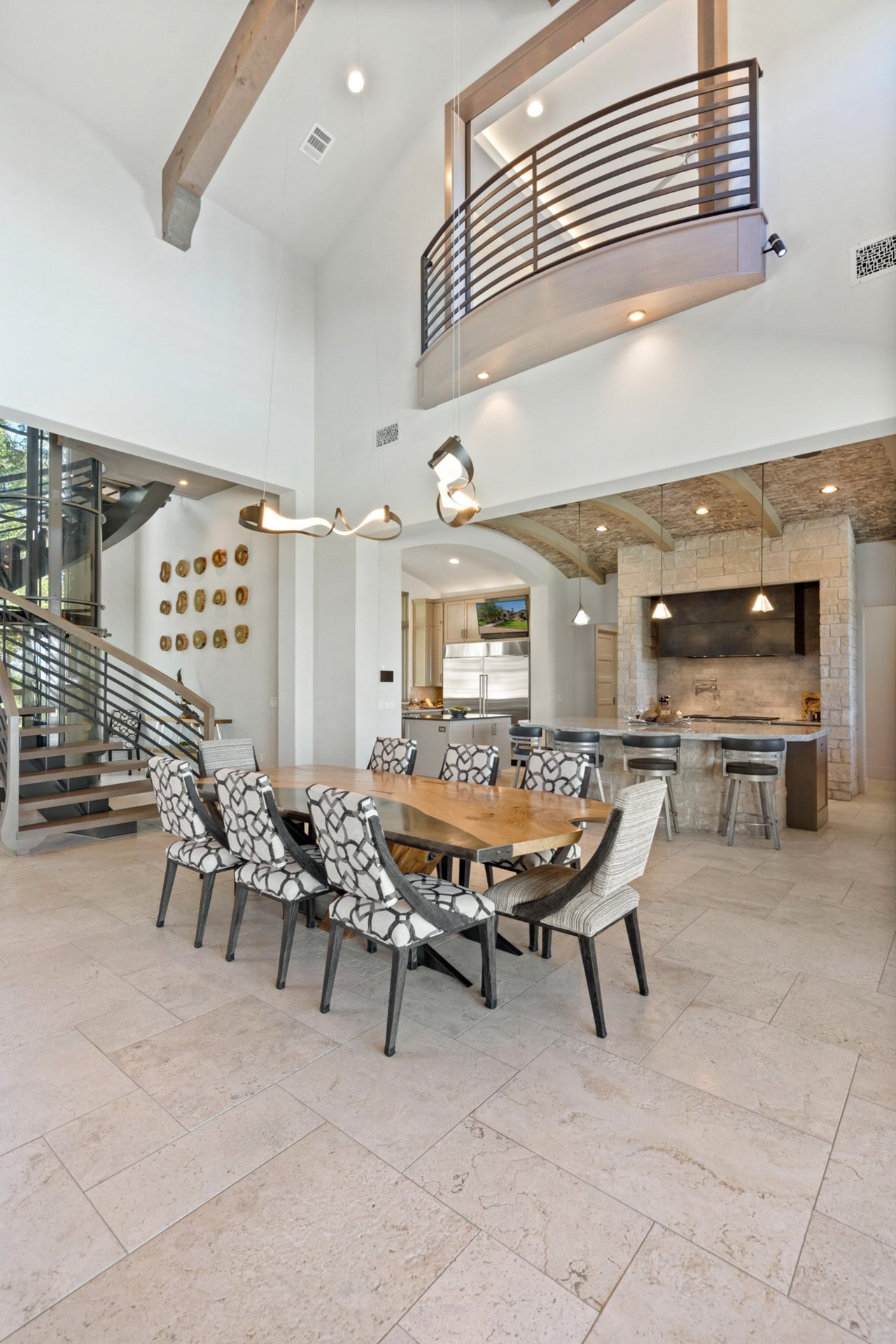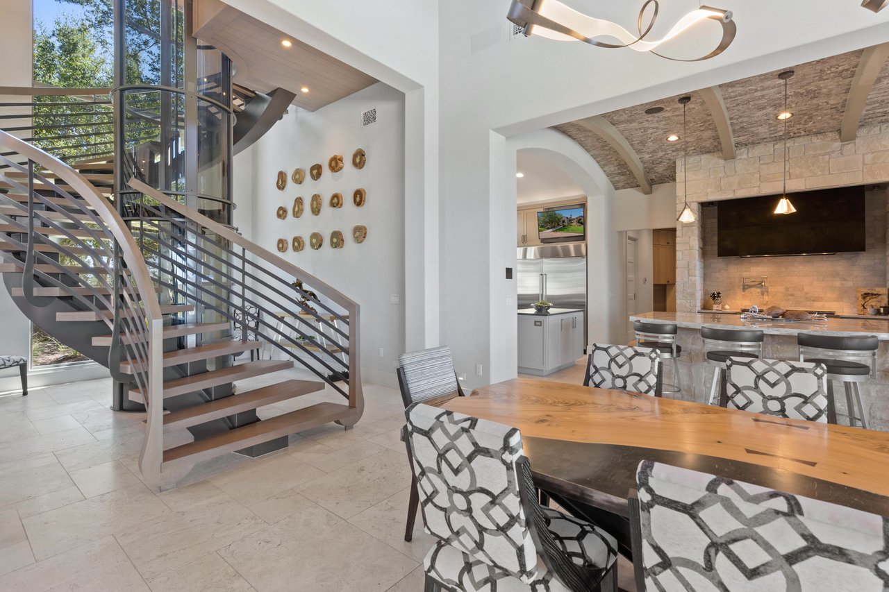 Step inside to discover a world of luxury and sophistication. The Great Room has soaring 25-foot high ceilings adorned with Douglas fir beams and a stunning floor-to-ceiling buff lueder stone fireplace. A custom steel spiral staircase, complemented by a cylindrical elevator, adds a modern touch to this timeless home.