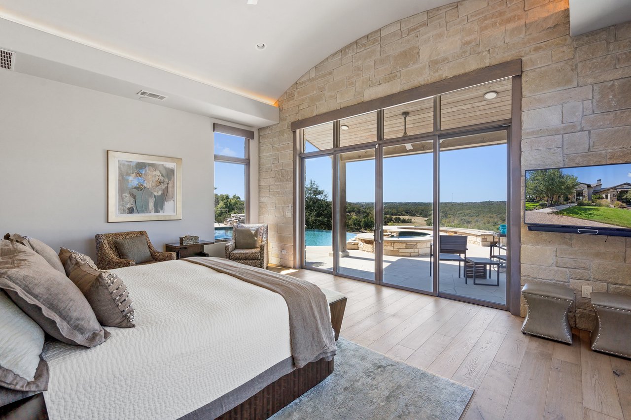 The second floor is home to two bedrooms, each with its own ensuite bathroom, providing privacy and comfort. From the game room, step out onto the expansive balcony to enjoy the largest panoramic view of the stunning hill country landscape. The spacious game/media room is a highlight of the home, featuring a pool table, gaming table, and a large sectional, perfect for entertainment and relaxation. This room also showcases a charming Juliet balcony that offers a unique vantage point overlooking the dining area below.